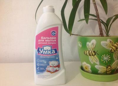 Si consiglia a molte giovani madri di utilizzare Umka, un detersivo per piatti ipoallergenico per bambini. È progettato specificamente per lavare biberon, capezzoli, giocattoli e altri oggetti con cui il bambino entra in contatto. Il balsamo è ben lavato via anche con acqua fredda e senza residui.. Contiene anche ingredienti antibatterici. A causa dell'assenza di sostanze aggressive, il balsamo può essere utilizzato per lavare i piatti da cui vengono nutriti i bambini più piccoli dall'età di 0 anni. Il costo è di circa 70-80 rubli.