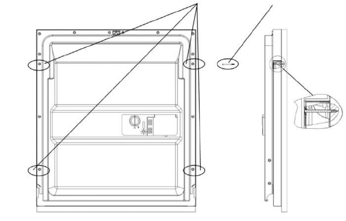 Baigę darbą su fasado tvirtinimu, turite pereiti prie korpuso šoninių tvirtinimų. Norint atlikti šoninių tvirtinimo detalių darbus, iš indaplovės reikia ištraukti viršutinį indų krepšį ir iš vidaus įsukti varžtus į šonines sieneles. Savisriegiai varžtai turi būti tinkamo ilgio.