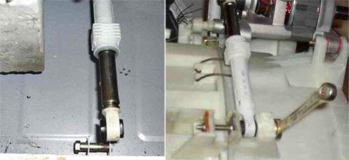 - Atjungus apatinį amortizatoriaus laikiklį, reikia panašiai atjungti amortizatoriaus laikiklį nuo skalbimo mašinos vonios. Jis tvirtinamas tokiu pačiu būdu, varžtu arba kaiščiu.