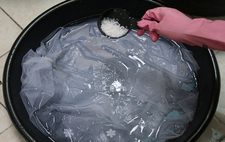 Tiulis turi būti mirkomas 30 minučių. Tada galite pradėti skalbti audinį įprastu būdu.